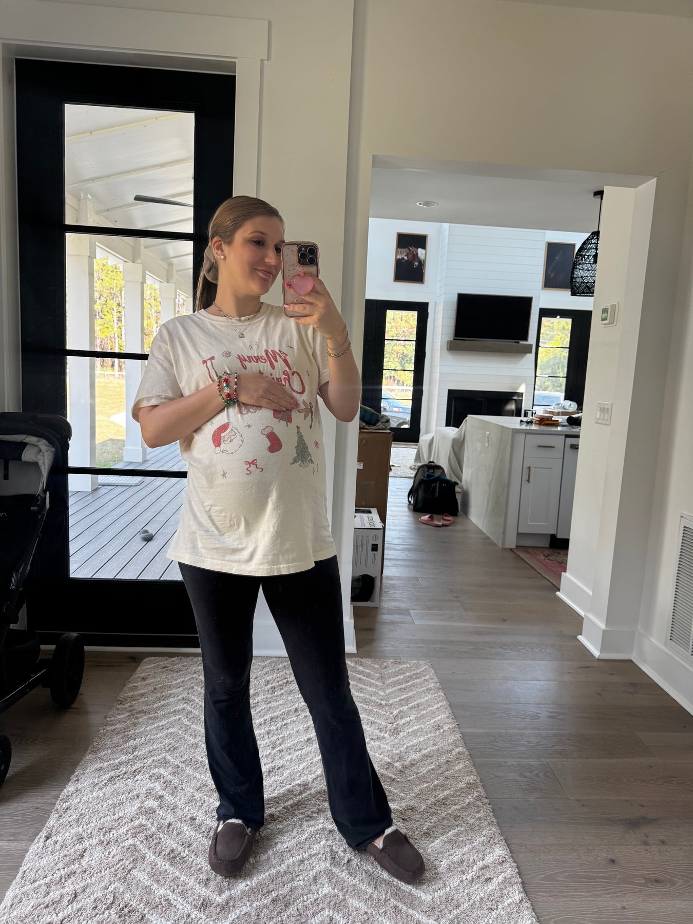 This adorable Christmas tee is true to size and 100% cotton. So cute for Christmas in the south…where we have days that feel more like spring than winter. Eliza is wearing a large.